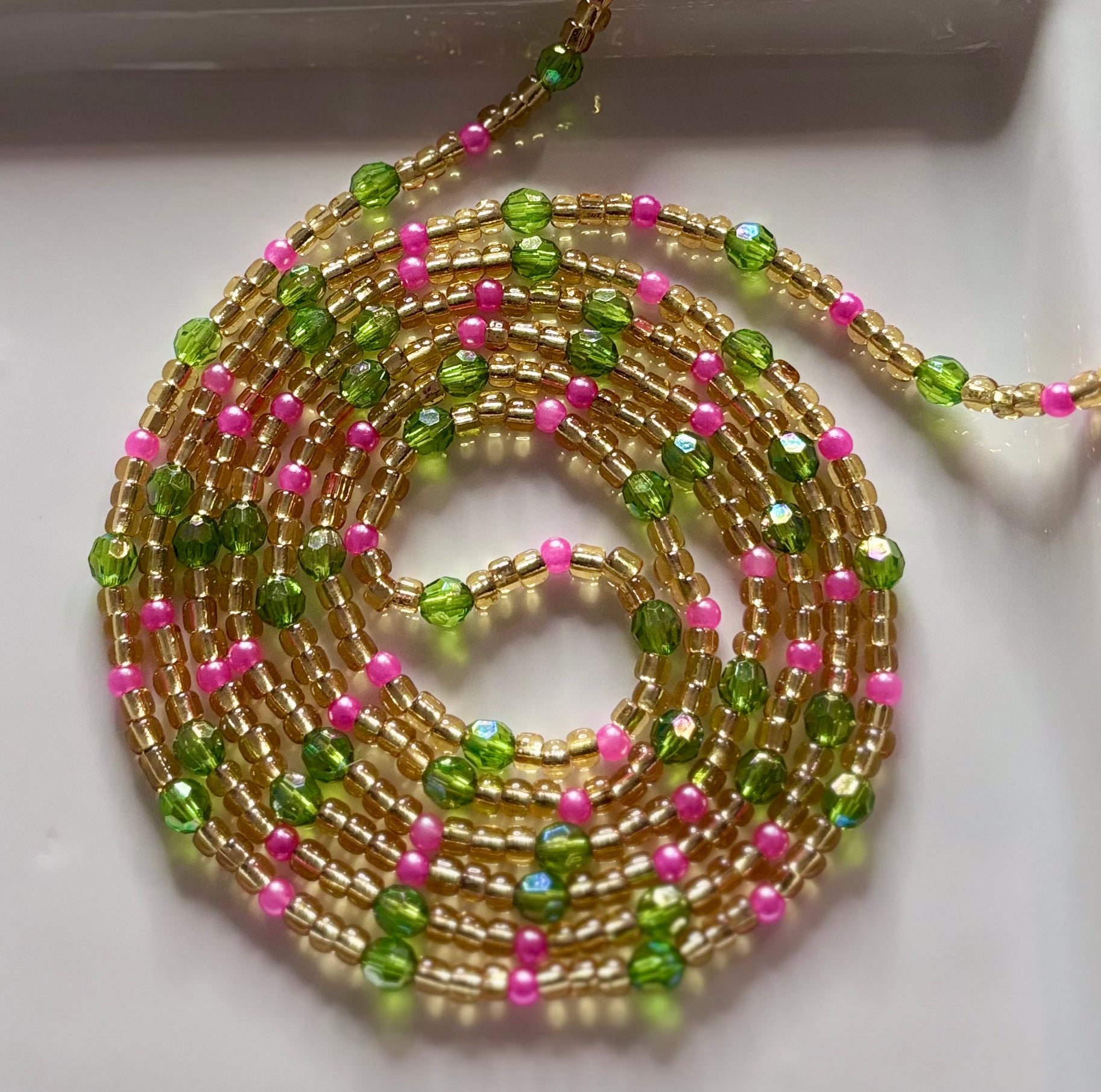 A luminous strand inspired by the legacy of Alpha Kappa Alpha Sorority, Inc. — where sisterhood blooms and service shines. Featuring golden beads for prestige, pink for grace, and green for growth, Ivy Radiance wraps you in elegance and empowerment.
